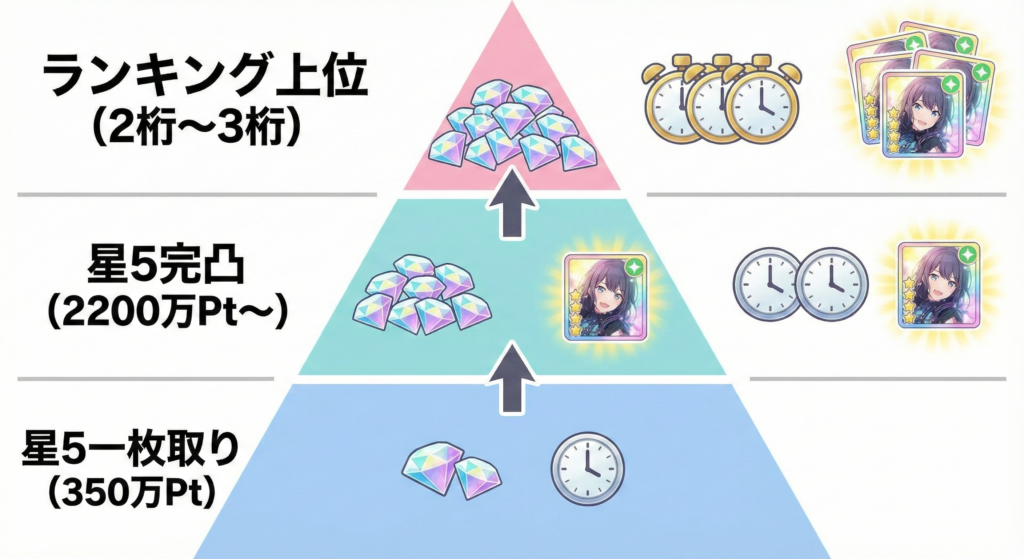 - 星5カード1枚取り(350万Pt):多くのプロデューサーが目指すライン。イベントストーリーを楽しみながら、報酬カードを確保します。