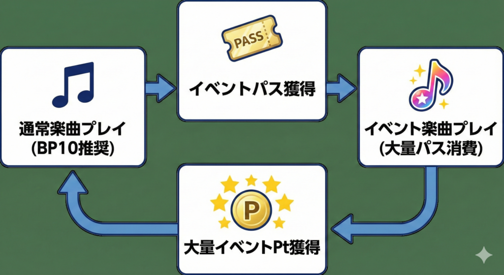 - イベント楽曲をプレイ:集めたパスを消費して、大量のイベントポイントを獲得する。