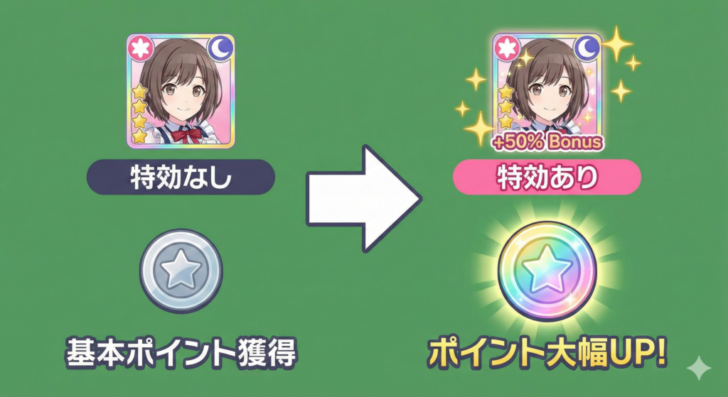 スカウトで入手できる特効カードを編成(サポート含む)に入れると、獲得イベントポイントにボーナス倍率がかかります。