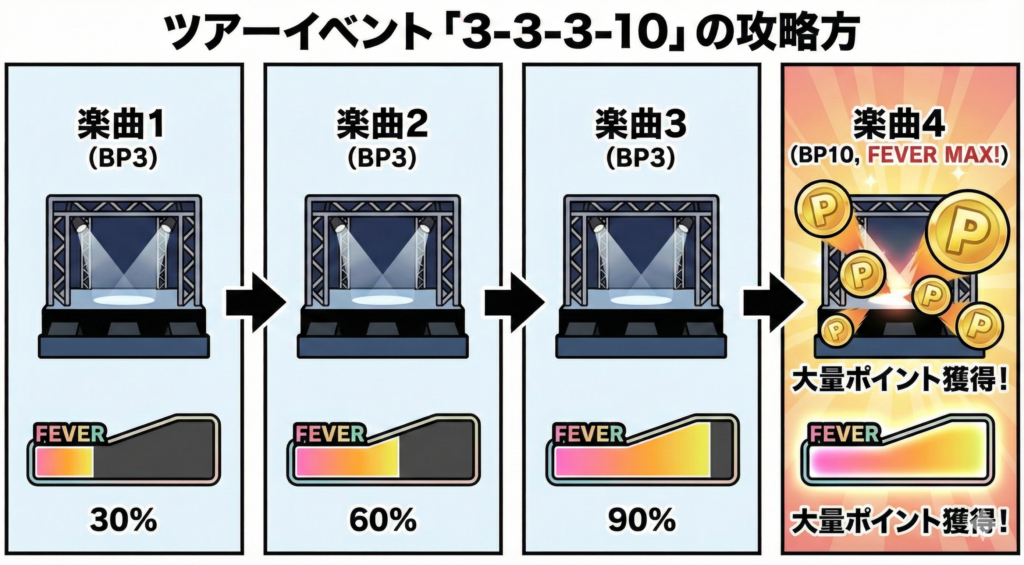 「ツアーイベント」は、通常のイベントとは異なる形式で行われます。マップを進めながら4曲セットのライブを行う形式で、報酬システムも独特です。