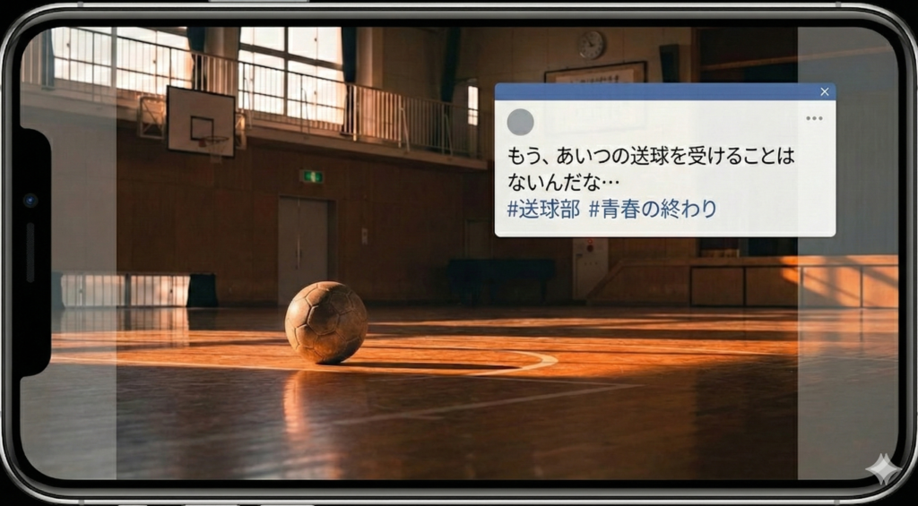 このタイプは、最も拡散力が強い形式です。夕焼けの校庭、汗と泥にまみれたユニフォーム、あるいは体育館の薄暗い照明など、ノスタルジックな情景を背景に設定し、核心を突く一言のみを添えます。