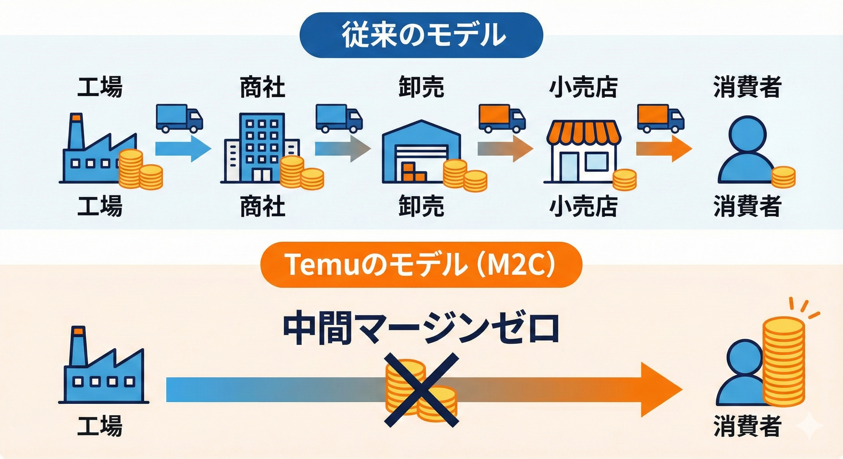- Temuのモデル: 工場 → 消費者(中間マージンがゼロ)