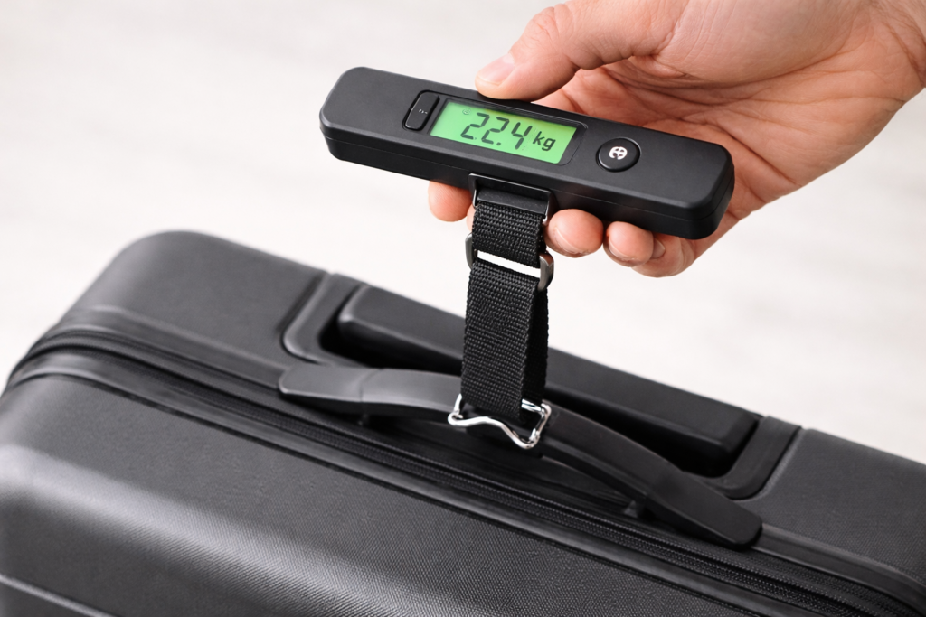 - ラゲッジスケール(吊り下げ秤)を持つ Amazonなどで千円〜二千円で購入できる携帯型のデジタルスケールは、長期旅行の必須アイテムです。パッキング後に自宅やホテルで重さを測り、調整してから空港へ向かいましょう。