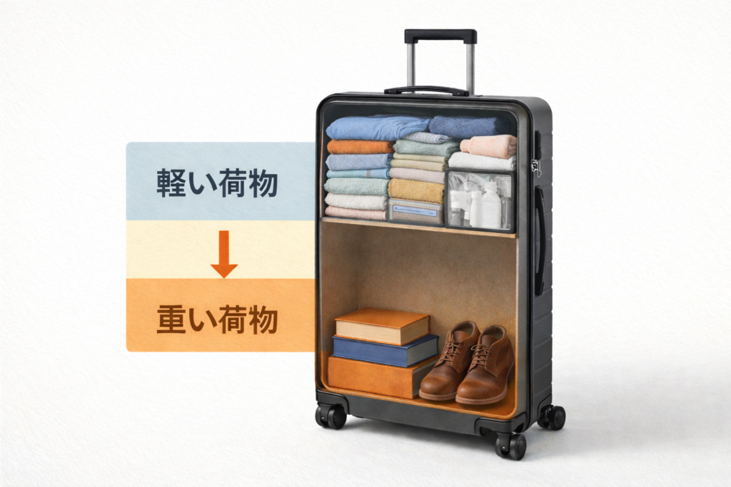 同じ20kgのスーツケースでも、詰め方一つで引いた時の重さが変わります。 基本は**「重いものを下(キャスター側)に、軽いものを上(ハンドル側)に」**配置することです。