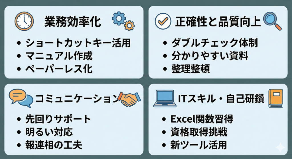 - 目的意識を持つ:事務作業に意味を見出し、モチベーションに変える。