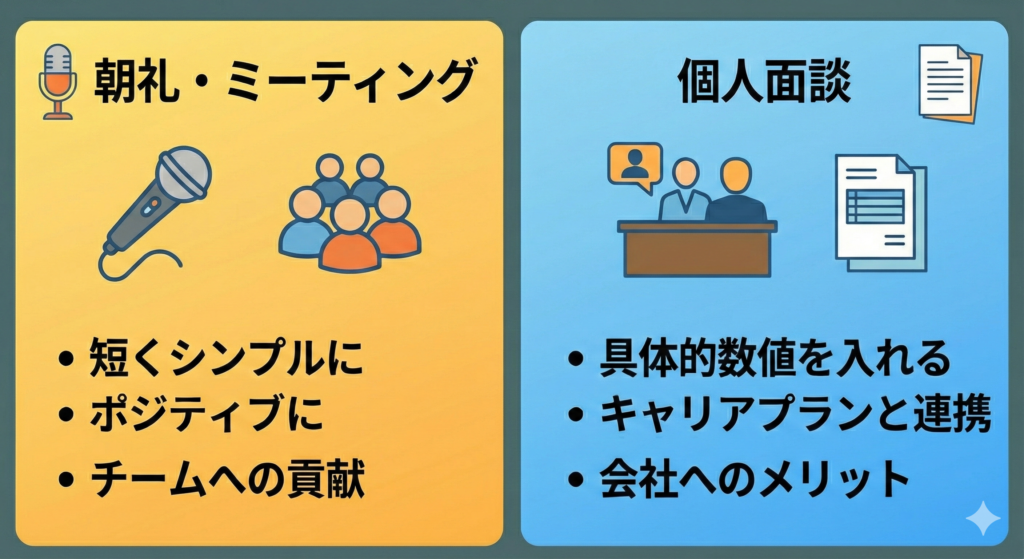 大勢の前で話すときは、「短く・ポジティブに・具体的すぎず」がポイントです。長々と個人の細かいスキル目標を話すよりも、チーム全体への貢献を意識しましょう。