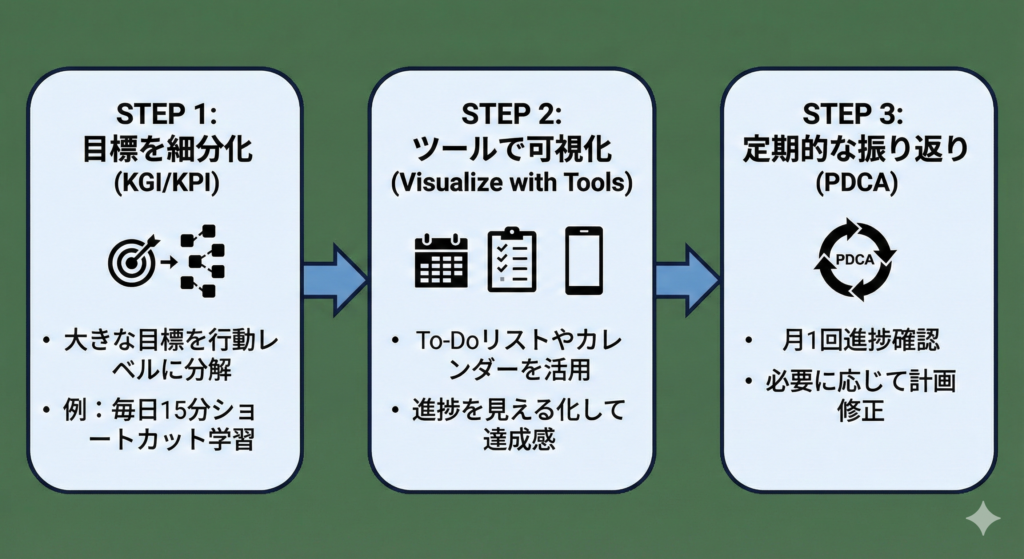 「効率化する」という大きな目標(KGI)だけでは動き出せません。「毎日15分、ショートカットキーを覚える」「月曜日はマニュアル作成の時間にする」といった小さな行動目標(KPI)に落とし込みましょう。