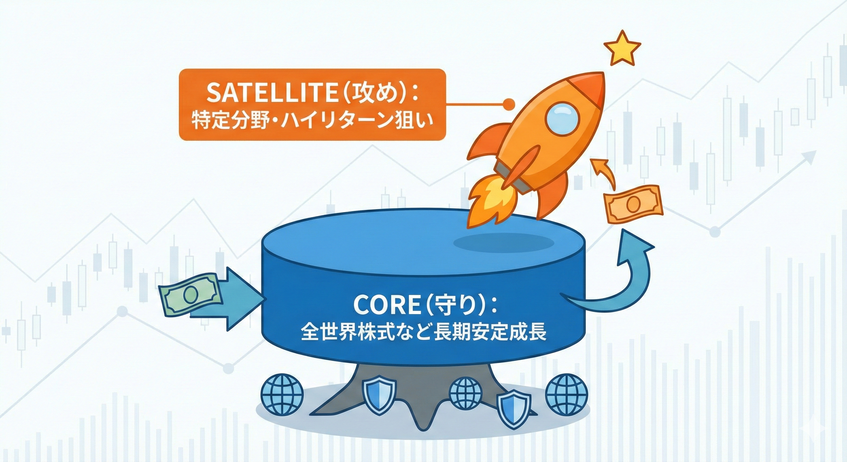 資産の土台となる「コア」部分で全世界の成長を取り込みつつ、「サテライト」部分で特定分野(ハイテク)の大きなリターンを狙う作戦です。